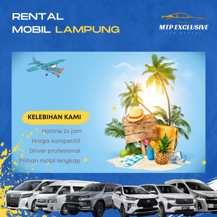 MTP EXCLUSIVE merupakan pusat penyedia jasa rental dan sewa mobil terdekat, terbaik dan terpercaya di kota Bandar Lampung, provinsi Lampung, Indonesia. Kami memberikan informasi daftar harga jasa rental dan sewa mobil untuk membantu anda yang membutuhkan kendaraan sewa atau rental di kota Bandar Lampung, baik untuk kegiatan wisata, bisnis maupun untuk perjalanan dinas dengan layanan profesional, harga murah dan pilihan kendaraan yang lengkap (seperti : Avanza, Xenia, Innova Reborn, Innova Zenix, Fortuner, Pajero, Hiace dan Alphard).